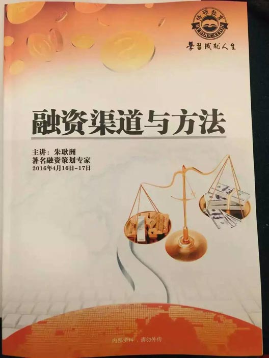 2016年4月16、17日,中国资本策划研究院(CCP)院长朱耿洲博士应会南地区优秀的高端培训教育机构--广州博研管理科学研究院邀请,为博研教育“金融投资与商业模式创新高级研修班”的120多位企业家们激情讲学两天,讲授主题为《融资策划36计(方法与渠道)》,朱耿洲博士分享了精彩的融资策划与资本运作实战理念、案例与精髓,还特别介绍了信用卡贷款、经营融资、品牌融资、税务策划融资等几十种适合广东中小微企业的融资工具、方法与渠道。