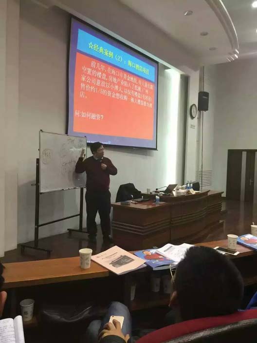 2016年1月9、10日,中国资本策划研究院(CCP)院长朱耿洲博士应邀再次来到上海为上海交通大学《资本运营总裁高级研修班》18、19期的学员授课,授课主题为《融资策划36计(方法与渠道)》,朱博士系统地讲述了适合上海地区企业36种主要融资渠道、200多种实战融资方法。 本期也是中国资本策划研究院“融资策划36计”知识体系全国大巡讲2016年的第一期,还是《资本运营总裁高级研修班》18期的学员的收班课,朱博士的到来也是众目期待,朱博士在课堂上对“互联网金融破解中小企业融资难题”的论述成为学员们关注的热点。