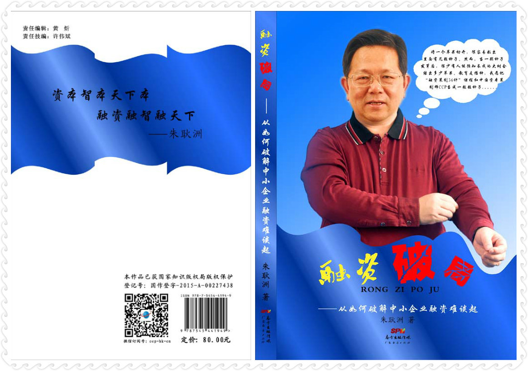 金秋十月,收获季节。耗时7年、凝聚朱耿洲博士无数心血的力作——《融资破局——从如何破解中小企业融资难谈起》正式出版发行!该书以“破解中小企业融资难,提升当代企业融投资策划与资本运作核心竞争力”为宗旨,大至宏观金融政策、小到企业素质内功,全方位畅谈如何冲破中国中小微企业融资难的固有桎梏与混乱局面,首次提出“融资策划和资本运作改变中小企业的生存命运、发展模式及赢利模式”这一革命性的观念,为广大中小企业指明企业发展前进的方向!该书同时也获得国家知识版权保护(国作登字-2015-A-00227438)。