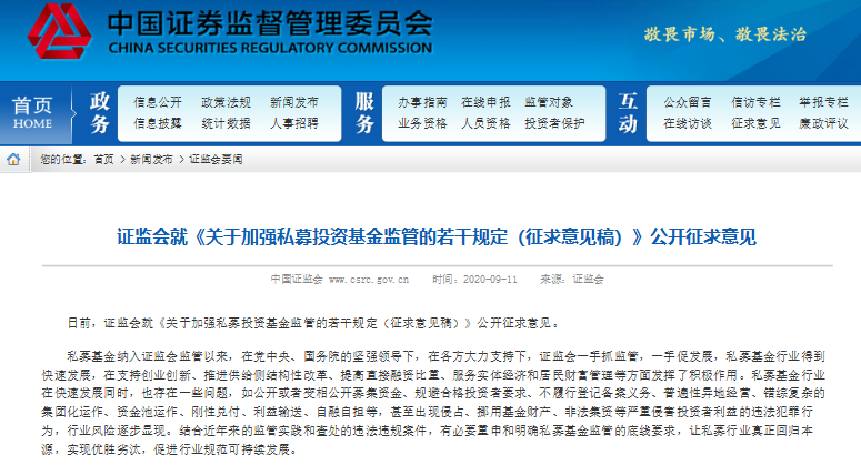证监会9月11日发布了《关于加强私募投资基金监管的若干规定(征求意见稿)》(简称征求意见稿),旨在严厉打击各类违法违规行为,严控私募基金增量风险,稳妥化解私募基金存量风险,提升行业规范发展水平,保护投资者及相关当事人合法权益。