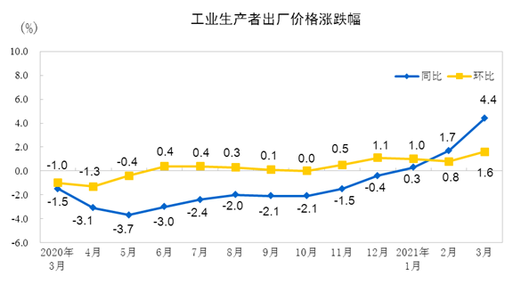 2021年3月份,全国工业生产者出厂价格同比上涨4.4%,环比上涨1.6%;工业生产者购进价格同比上涨5.2%,环比上涨1.8%。1—3月平均,工业生产者出厂价格比去年同期上涨2.1%,工业生产者购进价格上涨2.8%。