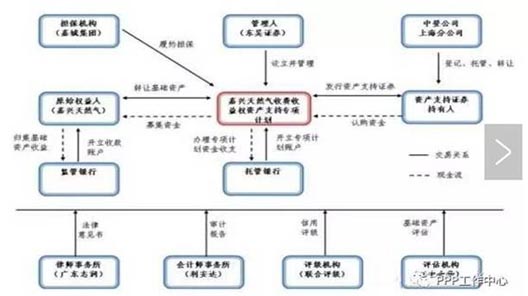 如下图所示,原始权益人嘉兴市天然气管网建设管理有限公司将其基础资产——在特许经营期间及特许经营区域范围内享有的自专项计划成立之日起五年内每年9-12月份销售天然气的收费收益权转让至SPV(嘉兴天然气收费收益权资产支持专项计划),用于发行资产证券化产品,资产支持证券持有人出资认购,社会资本成功退出。