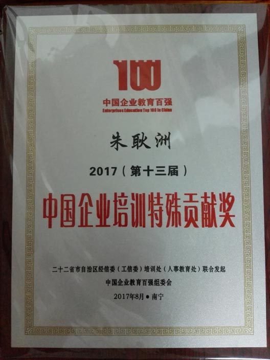 评价活动由行业媒体、行业专家、行业协会或中国企业教育百强组委会评审专家进行推荐、提名。鉴于中国资本策划研究院院长、广州市厦天顾问公司董事长、著名融资实战策划专家朱耿洲博士充分满足以上条件,多年在培训发展领域深度创新实践,为企业发展提供了源源不断的动力,经中国企业教育百强组委会提名为2017 年(第十三届)“中国企业培训特殊贡献奖”荣誉获得者。