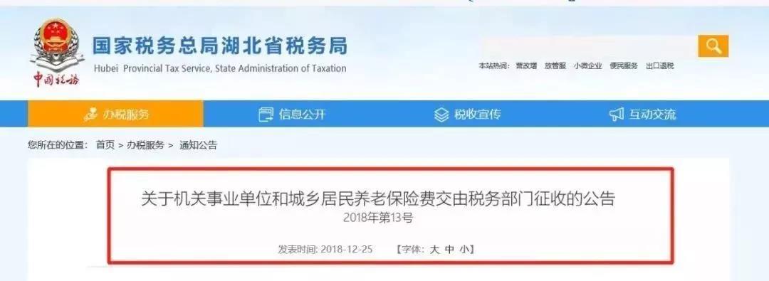 但是,有消息称,从2019年1月1日起,机关事业单位养老保险和城乡居民养老保险征收职能,先行移交至税务部门管理,而企业养老保险征收职能目前将暂缓移交,留待有关配套政策和制度完善后,再行移交。