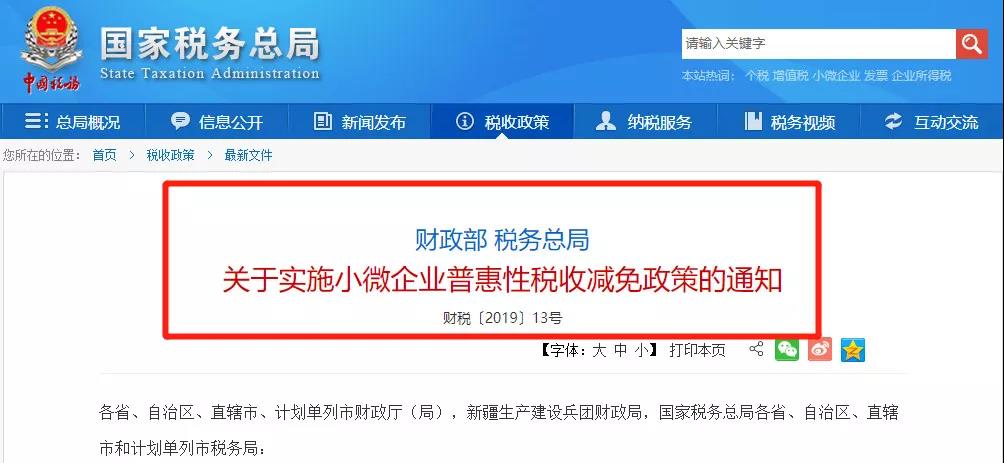 财税〔2019〕13号重磅发布:对小微企业推出一批新的普惠性减税措施。调整后,小型微利企业税负将降至5%和10%,增值税起征点将提至10万/月。