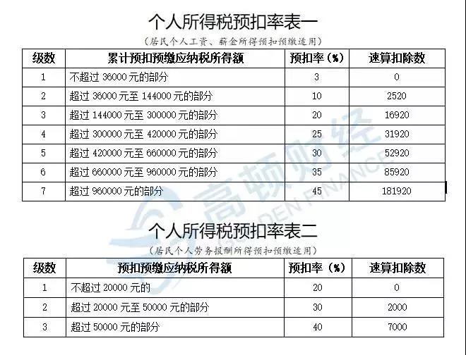 上述公式中,计算居民个人工资、薪金所得预扣预缴税额的预扣率、速算扣除数,按《个人所得税预扣率表一》执行。