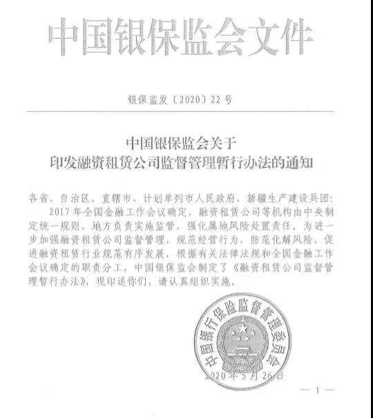 6月9日,银保监会正式印发《融资租赁公司监督管理暂行办法》,明确融资租赁公司业务体系、监管指标、过渡期等内容。《办法》明确,银保监会负责制定融资租赁公司的业务经营和监督管理规则。省级地方金融监管部门具体负责对本地区融资租赁公司的监督管理。