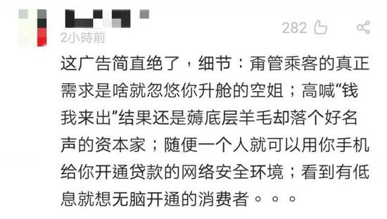 一位网友这样评论这则广告:“我本来以为这个广告是假的,没想到真是京东金融拍的。太雷了。从策划到立案到财务拨款再到上架推广,这么多环节都没发现有问题吗?偷换概念、歧视,都粘点儿。”