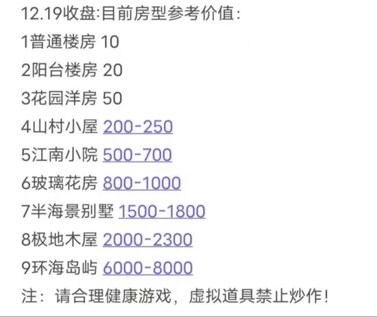 在周一兰接触的众多玩家中,初级玩家的心态普遍是,虽然虹宇宙内测体验槽点满满,但能赚一点是一点。而高峰时期,在交流群内,有人会发出房产每日交易的开盘、收盘价格,闲鱼上也有专门的虚拟房源交易中介人员,彼时这些房源的价格一天高过一天。