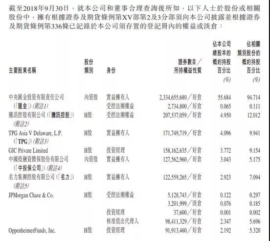 根据中金公司发布的2018年三季度业绩报告,按照这一持股比例,阿里巴巴成为了继中央汇金投资有限责任公司(持股比例55.68%)和腾讯(持股比例4.95%)之后的第三大股东。