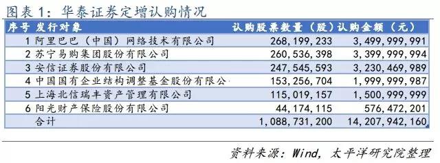 2018年,华泰证券定增募集资金142.08亿元,发行对象为阿里巴巴、苏宁易购、安信证券、国有企业结构调整基金、北信瑞丰和阳光财险。上述投资者认购的本次发行的股份预计将于2019年8月2日上市流通。其中,阿里巴巴认购金额为35.00亿元。