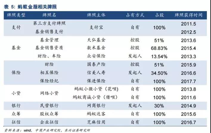 另据东兴证券统计,目前阿里巴巴旗下蚂蚁金服已持有天弘基金、国泰财险、蚂蚁小贷等金融公司的控股权,拥有支付、基金、保险、小贷、银行等众多领域的相关牌照。