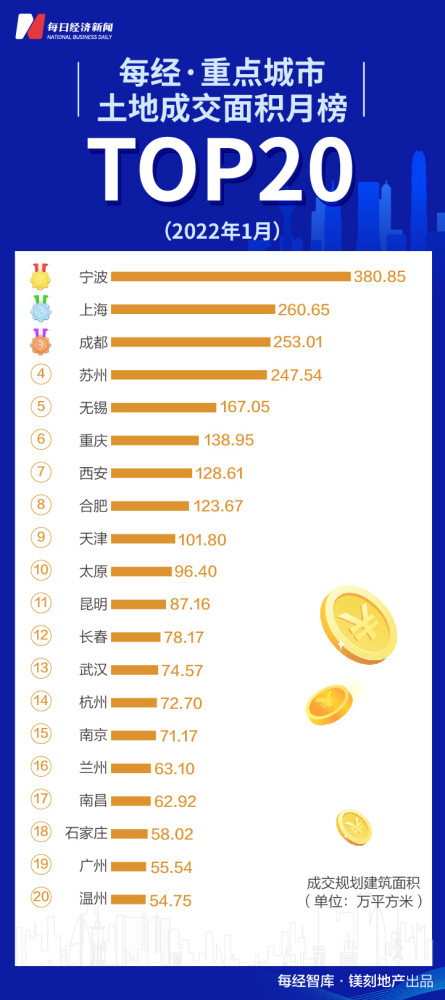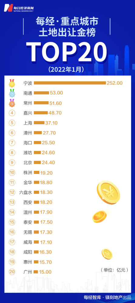 宁波由于1月份完成第三批集中供地,以土地出让金252亿元登上TOP20榜首,其余19个城市土地出让金均在15亿-53亿元之间。