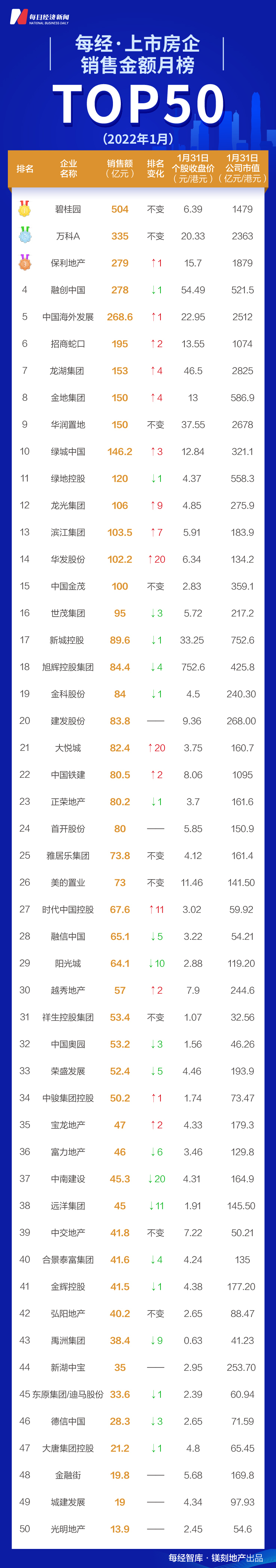 值得关注的是,新年伊始,上市房企排名争夺战拉开,仅9家房企保持了2021年12月份时的排名,3家房企上下浮动超20名,6家房企杀入榜单,更有多家房企在激烈的争夺中被挤出TOP50。