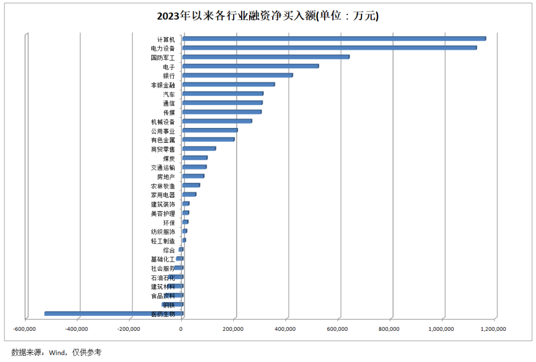 从区间增量上看,2023年以来,多数行业板块融资资金呈现净买入(注:本文所述融资净买入额=融资买入额-融资偿还额,下同),其中计算机、电力设备行业板块最受融资资金青睐,期间融资资金净买入金额均超过百亿元。国防军工、电子、银行、非银金融、汽车等行业板块融资资金净买入金额也较多,均在数十亿元级别。