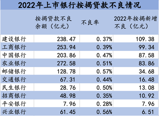 作者梳理,主要上市银行(6家国有大行+7家股份行,浦发银行尚未披露年报)涉房不良贷款新增规模达到1537.54亿元,较上一年多增961.7亿元,其中对公房地产新增不良1067.74亿元,住房按揭贷款新增不良469.8亿元。尽管按揭贷款不良率仍维持在较低水平,但不良规模增幅创纪录,2021年,住房按揭贷款新增不良规模为20.26亿元。