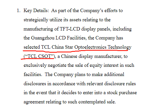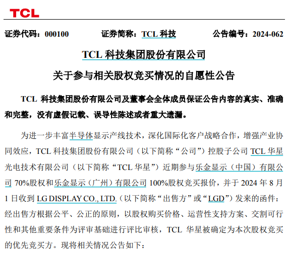 当日,公司收到LGD(LG DISPLAY CO., LTD.)发来的函件,TCL华星被确定为本次股权竞买的优先竞买方。