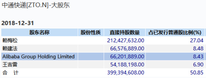 2018年5月,阿里巴巴系向中通快递投资13.8亿美元,持股约10%。目前,阿里巴巴对中通快递持股约8.43%,为其第三大股东。