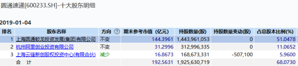 2015年5月,阿里巴巴联合旗下云锋基金投资圆通快递,当时持股约11%。2016年10月圆通快递借壳上市,截至2019年1月4日,阿里巴巴系合计持有圆通快递17%的股份。虽然阿里在2018年四季度减持圆通逾50万股,但仍是其第二大股东。