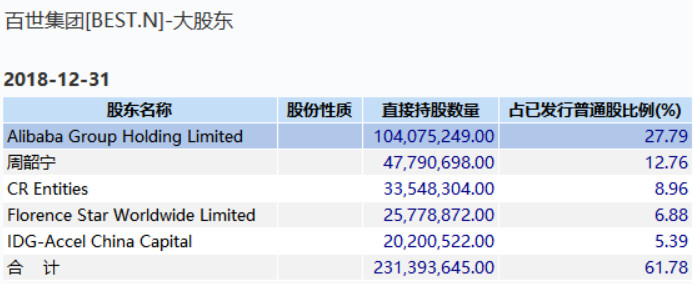 2007年,阿里与富士康共同在百世投资1500万美元,目前阿里持有上市公司百世集团27.79%股权,位列第一大股东。