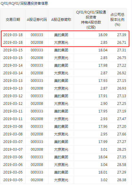 深交所披露数据显示,截至3月18日,美的集团QFII/RQFII/深股通投资者持有A股总数18.09亿股,持股比例由27.31%升至27.39%,刷新阶段新高,直逼28%的警戒线。大族激光QFII/RQFII/深股通投资者持有A股总数2.85亿股,持股比例由26.75%降至26.39%。